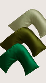 Each pillowcase is crafted from 22 momme 100% mulberry silk in our signature boomerang shape — designed for side sleepers, with a gentle curve that cradles your face, neck, and shoulder as you rest. The ultra-smooth silk surface creates minimal friction against your skin and hair compared to cotton, and the naturally non-absorbent fabric means your overnight skincare stays on your face where it belongs.